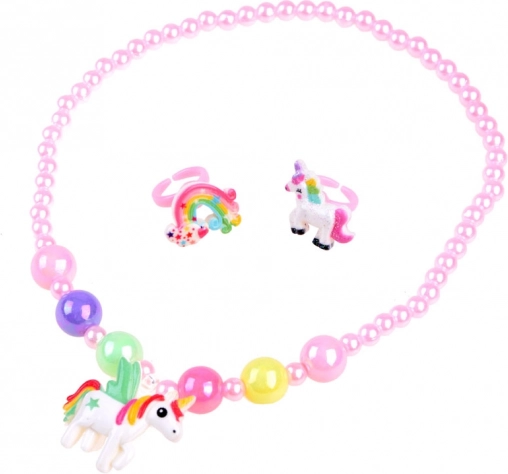 Цветно мънисто колие с висулка еднорог и два пръстена допълват костюма и подкрепят вълшебната игра.