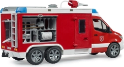 Напълно функционалната водна система с резервоар, помпа и навиваем маркуч позволява да се „угаси“ всеки пожар за миг. Светлинният и звуков модул подкрепя динамичните сценарии, докато меките протектори на гумите осигуряват уверено движение. Моделът е съвместим с аксесоарите BWORLD и може да се разшири с булдозерна дъска (Bruder 2581/2582) или да се комбинира с пожарната станция bworld (Bruder 62702).