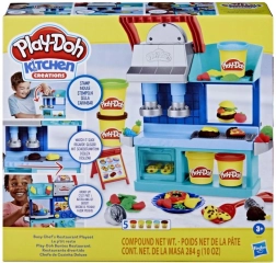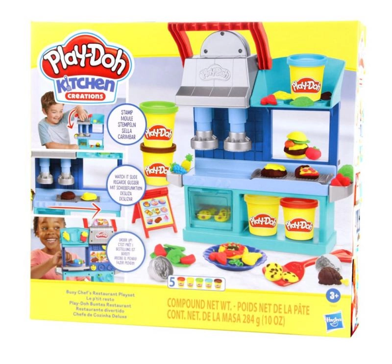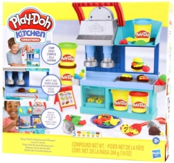 Оставете децата си да откриват света на готвенето с игралния комплект Play-Doh Кухненски Креации. Този интерактивен сет предлага множество възможности: децата могат да правят пица, бургери, паста или пиле с помощта на забавни формички — достатъчно е да натиснат лостчето и ястията са готови.