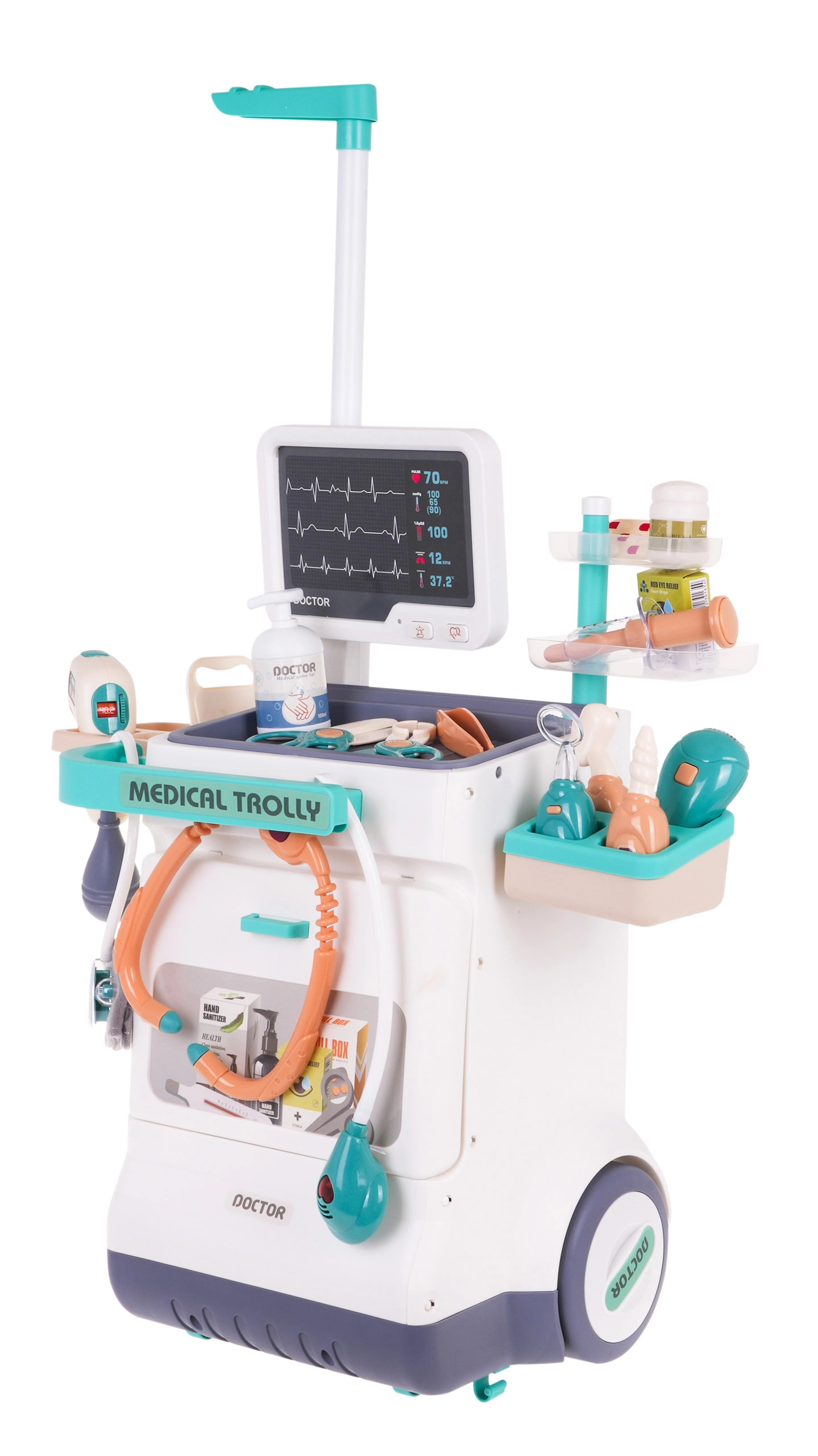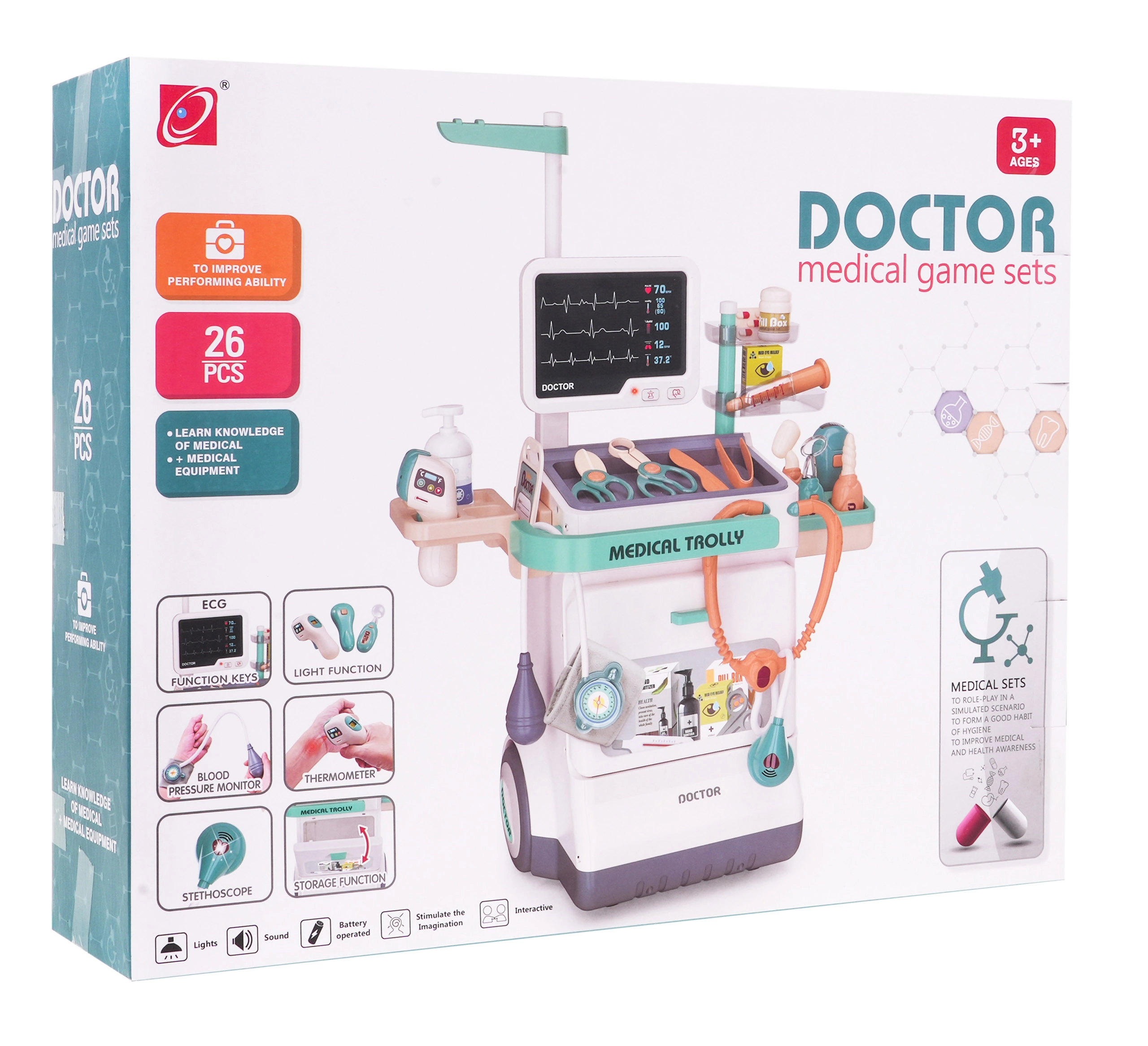 Тази интерактивна докторска количка е перфектният игрови сет, който позволява на вашите деца да станат лекари. Съдържа комплект от 26 медицински аксесоара, включително стетоскоп, термометър и ЕКГ устройство, които осигуряват реалистично и забавно игрово изживяване.