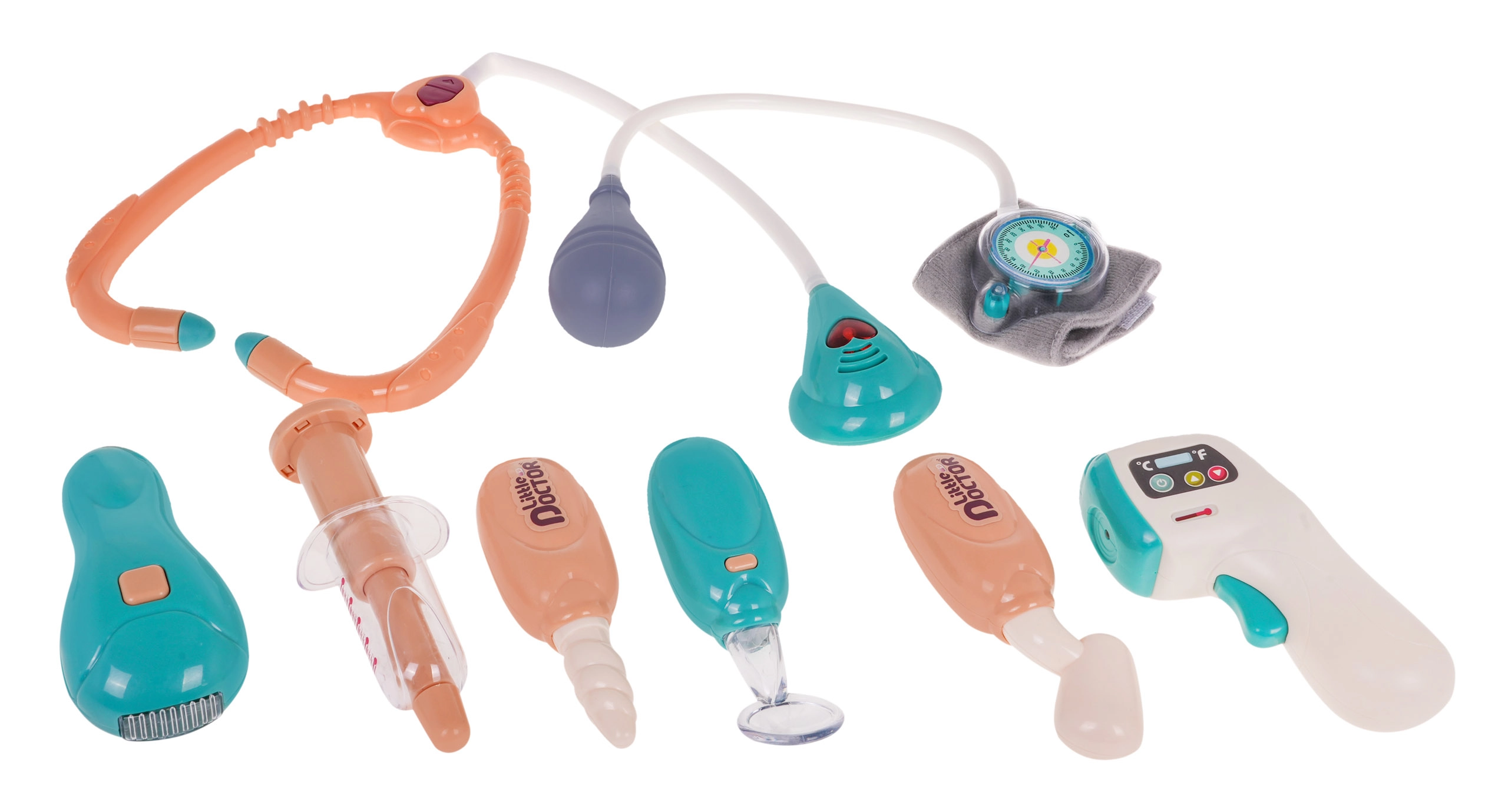 Устройства като термометър, стетоскоп и други инструменти се захранват с батерии и са готови за употреба. Батериите не са включени в комплекта.