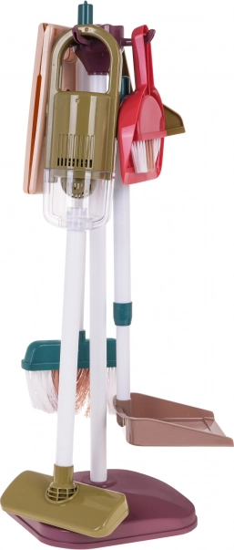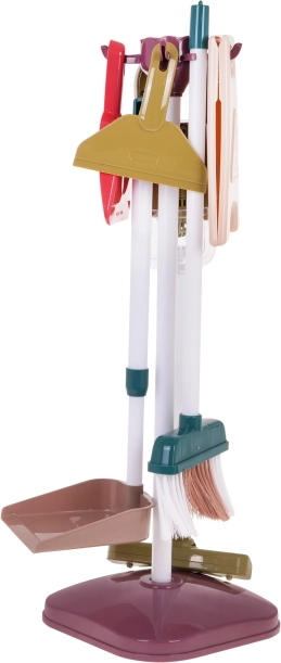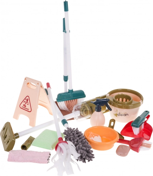Детският почистващ комплект включва инструменти като моп, четка, метли и малка прахосмукачка, които имитират истински уреди и придават реализъм на играта.
