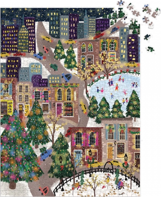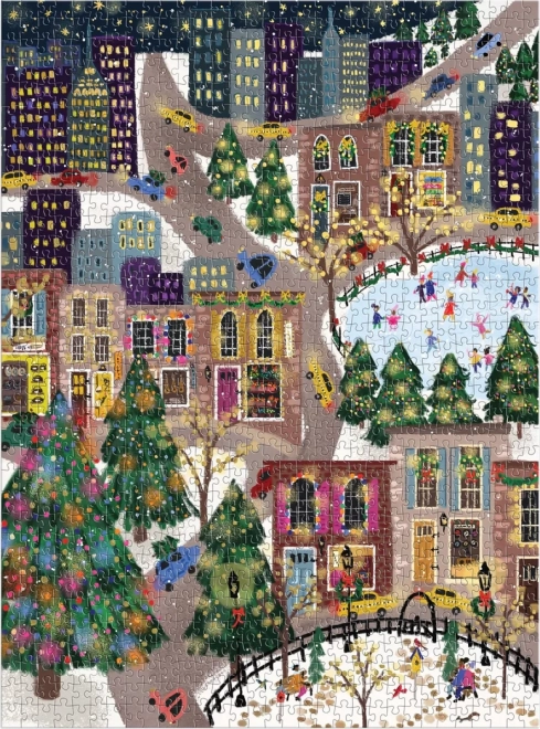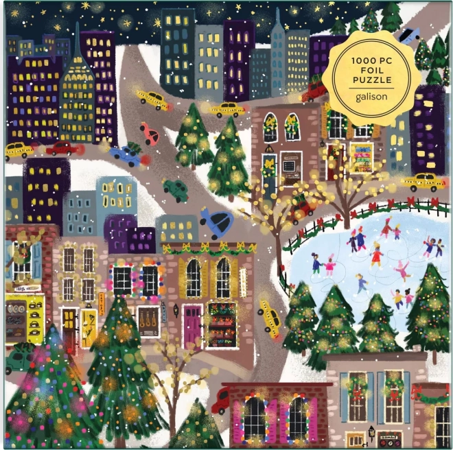 Открийте празнична градска сцена, пълна с цветове, светлинки и кънкьори. Пъзелът с металически фолия върху избрани части от мотива създава уникален бляскав ефект, който изпъква при различно осветление. Идеален подарък за любителите на пъзели и като зимна декорация за дома.