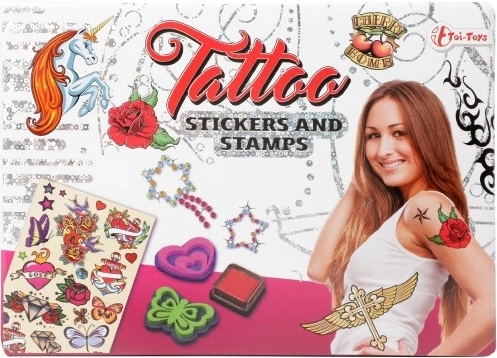 Този творчески комплект с временни татуировки и печати предлага на децата много забавление при украсяване на тялото и хартия. В кутията ще намерите листове с цветни мотиви (сърчица, цветя, пеперуди, котви и други), пяна печати и мастилена тампонка за лесно творчество. Идеален за детски празненства, карнавали и уикенд занимания у дома.