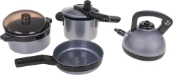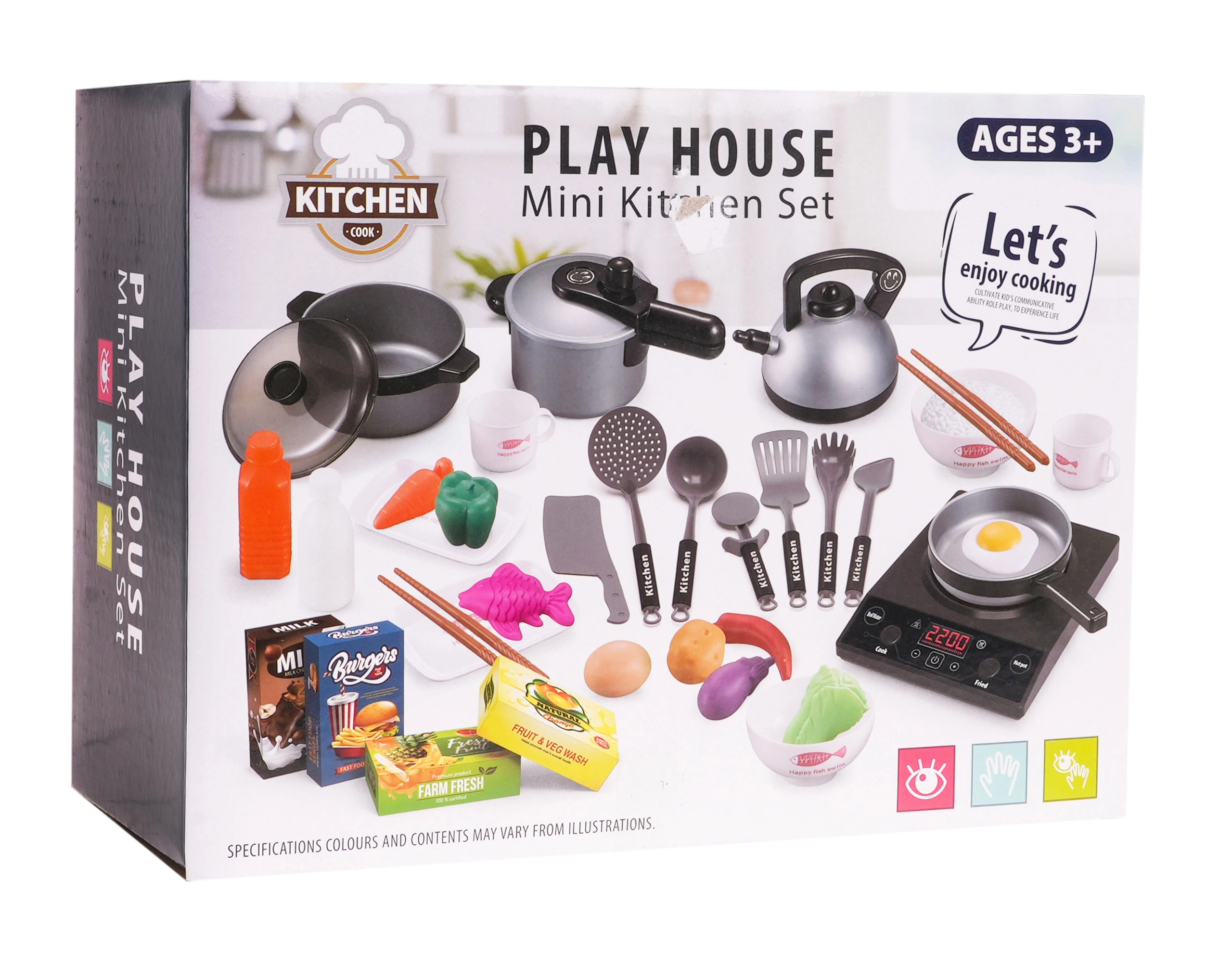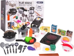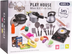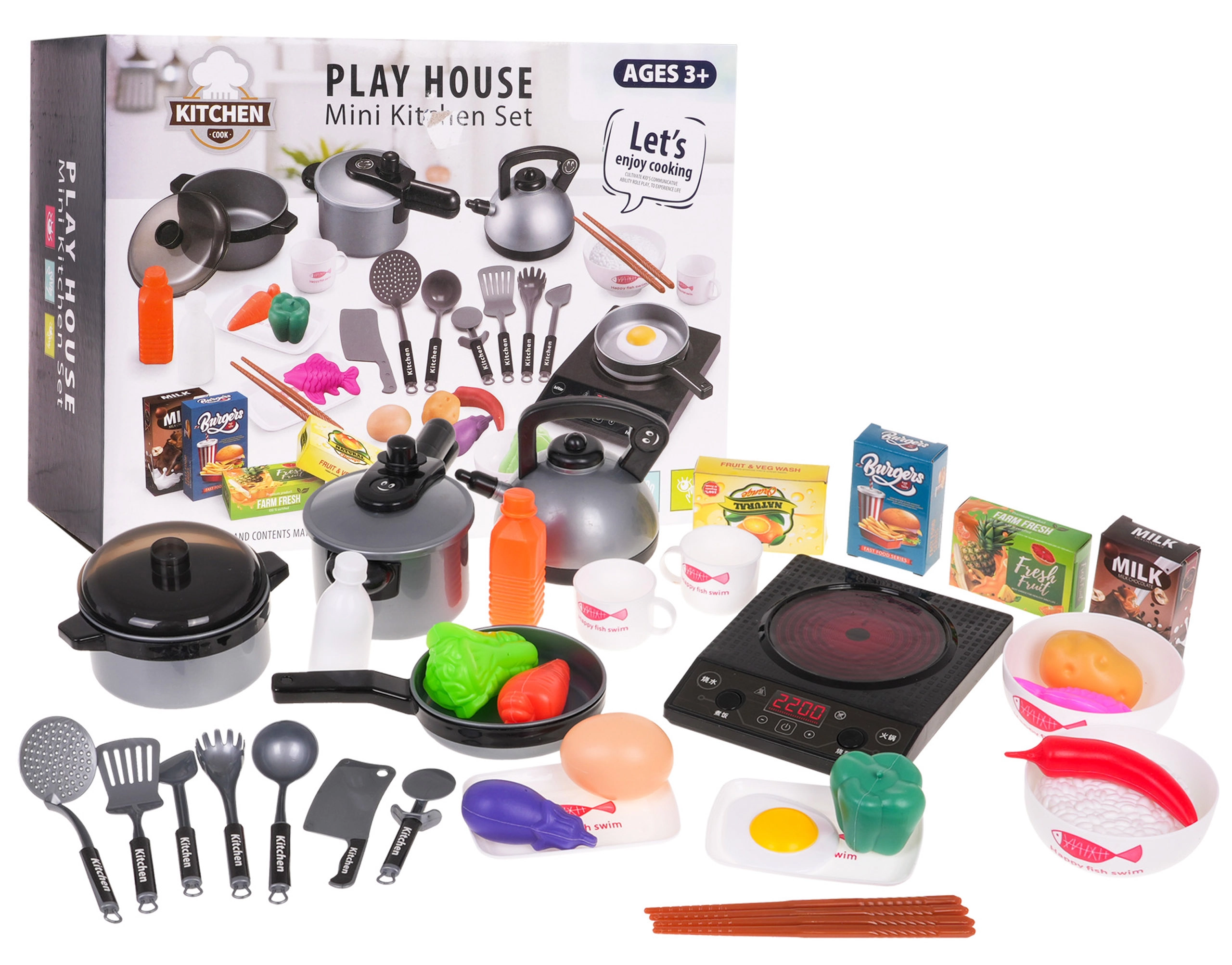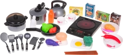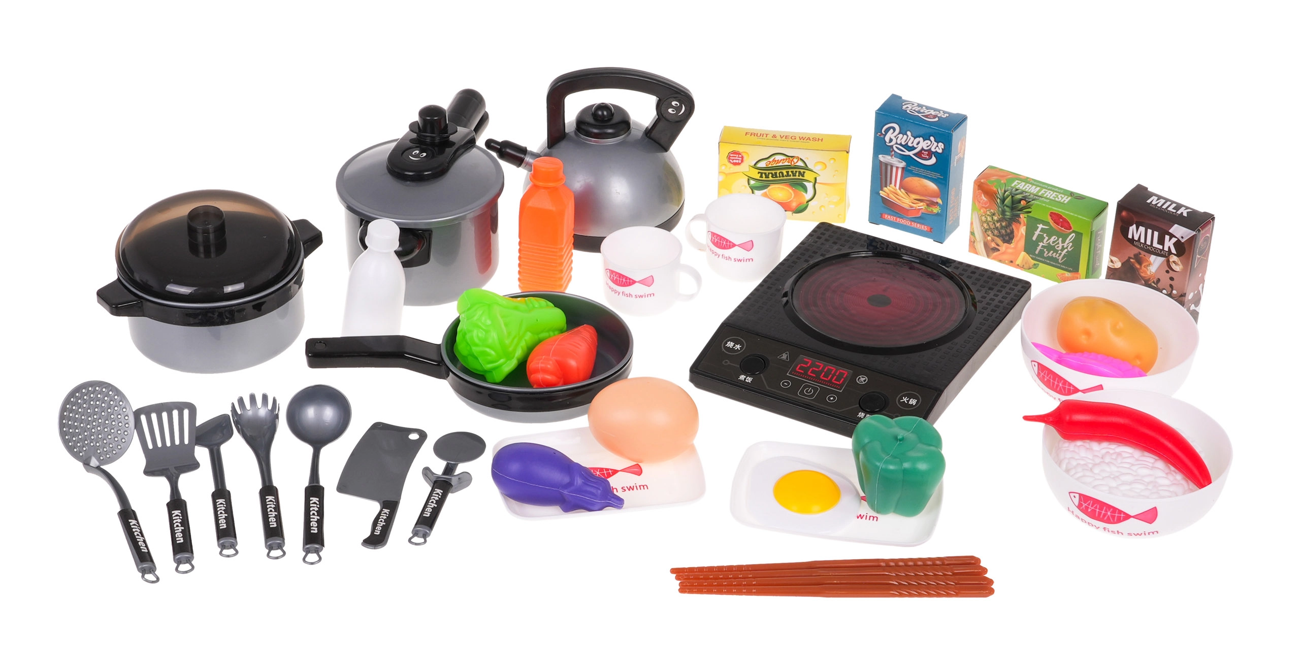Този удивителен кухненски комплект съдържа всичко, от което малкият готвач може да има нужда. Индукционен котлон, който се захранва с три AA батерии, позволява реалистични звуци на пържене и варене, а безопасните пластмасови елементи като тенджери, тигани и други аксесоари са идеални за детска игра, без остри ръбове и риск от нараняване. Комплектът включва различни макети на храни, включително яйца, риба и зеленчуци, които придават автентичност на играта.