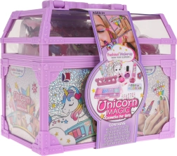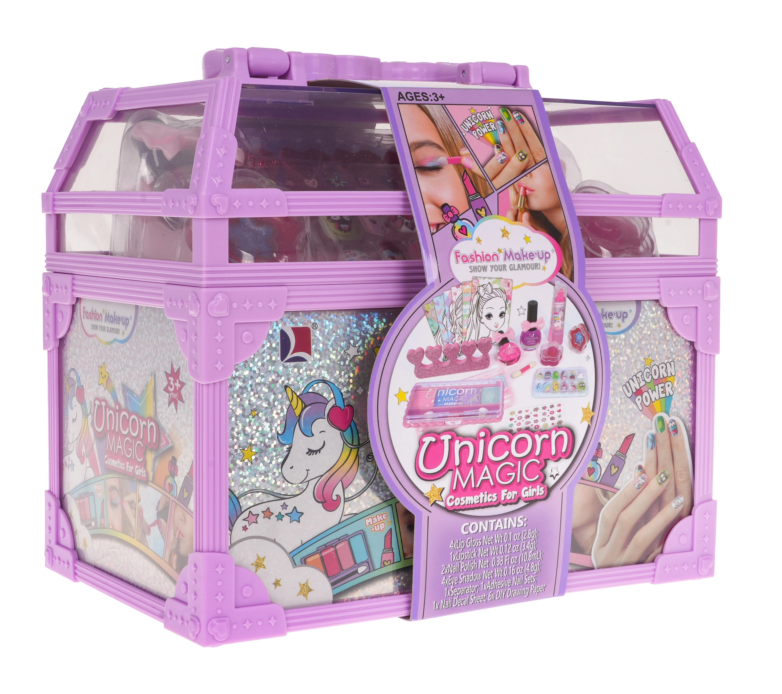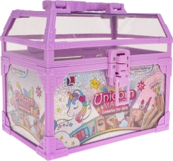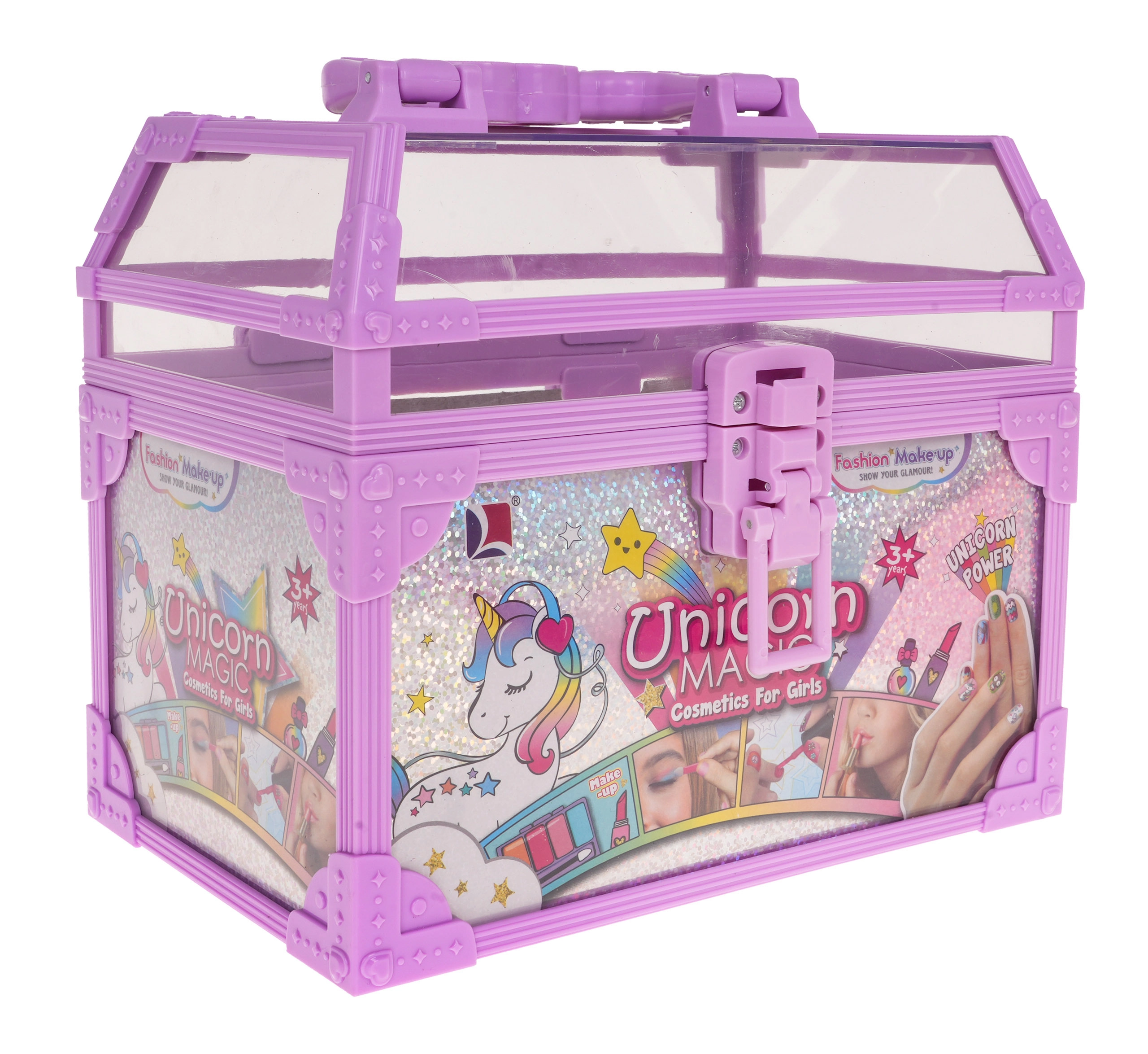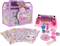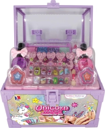 Съдържа различни цветове лакове за нокти, гланцове за устни и сенки за очи. Всичко е подредено в декоративна кутийка с мотив на еднорог.