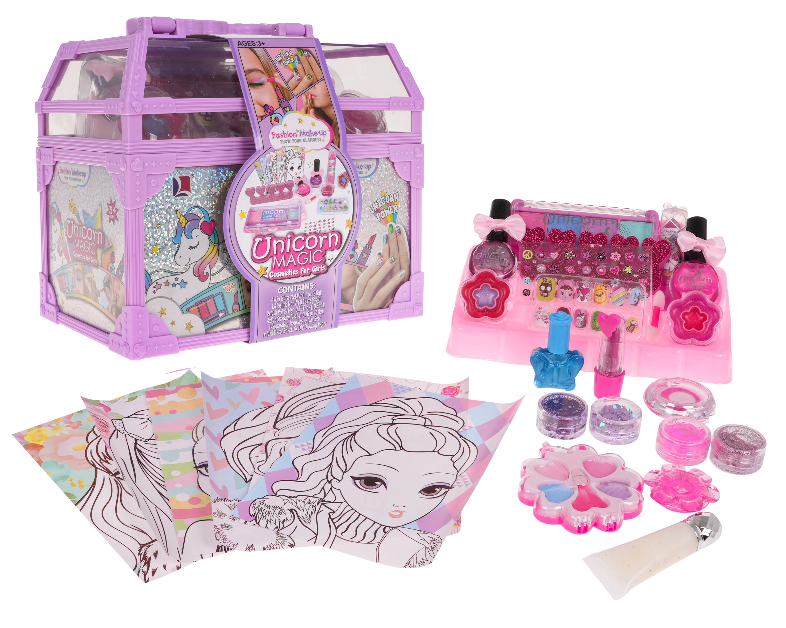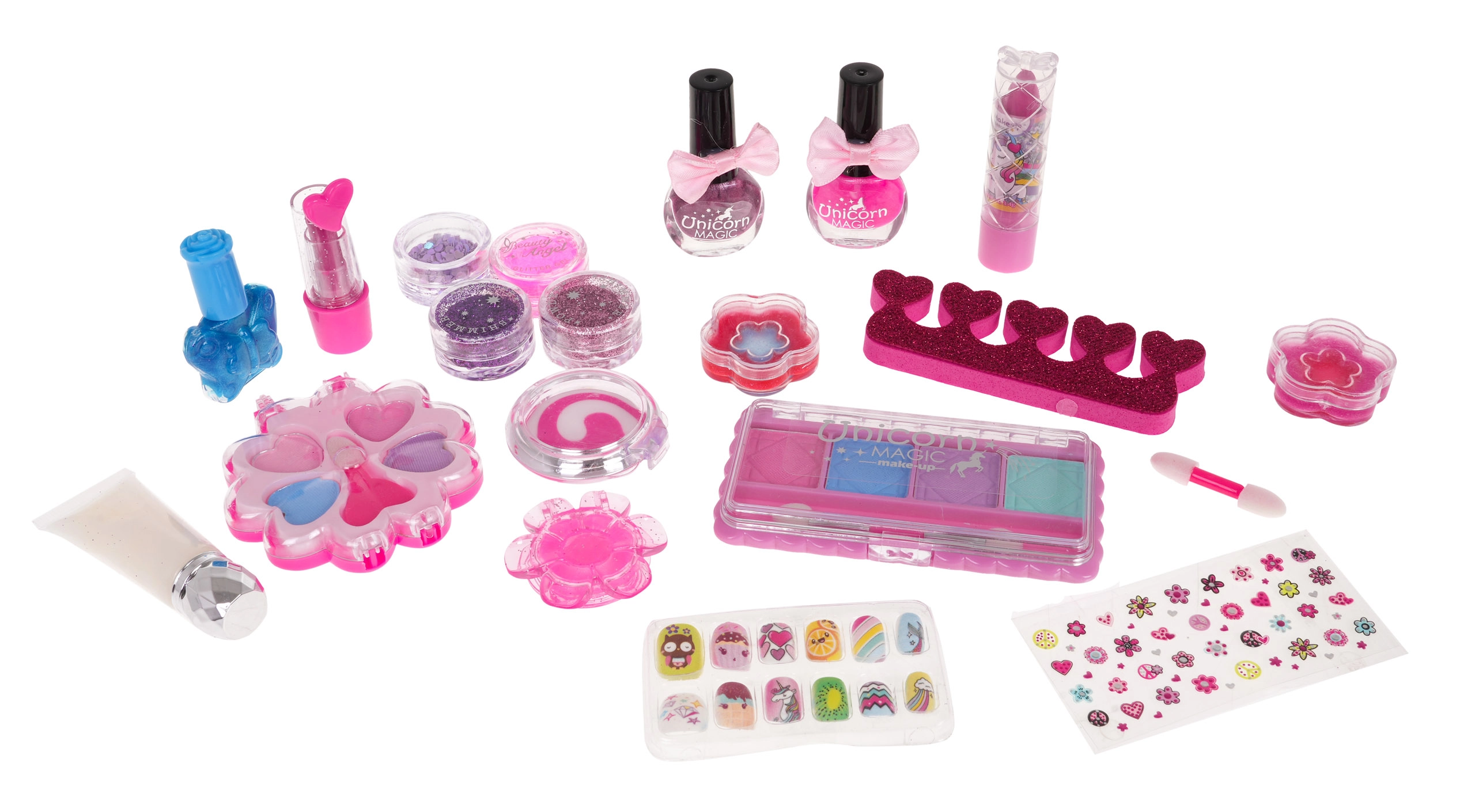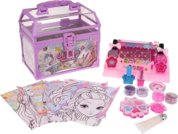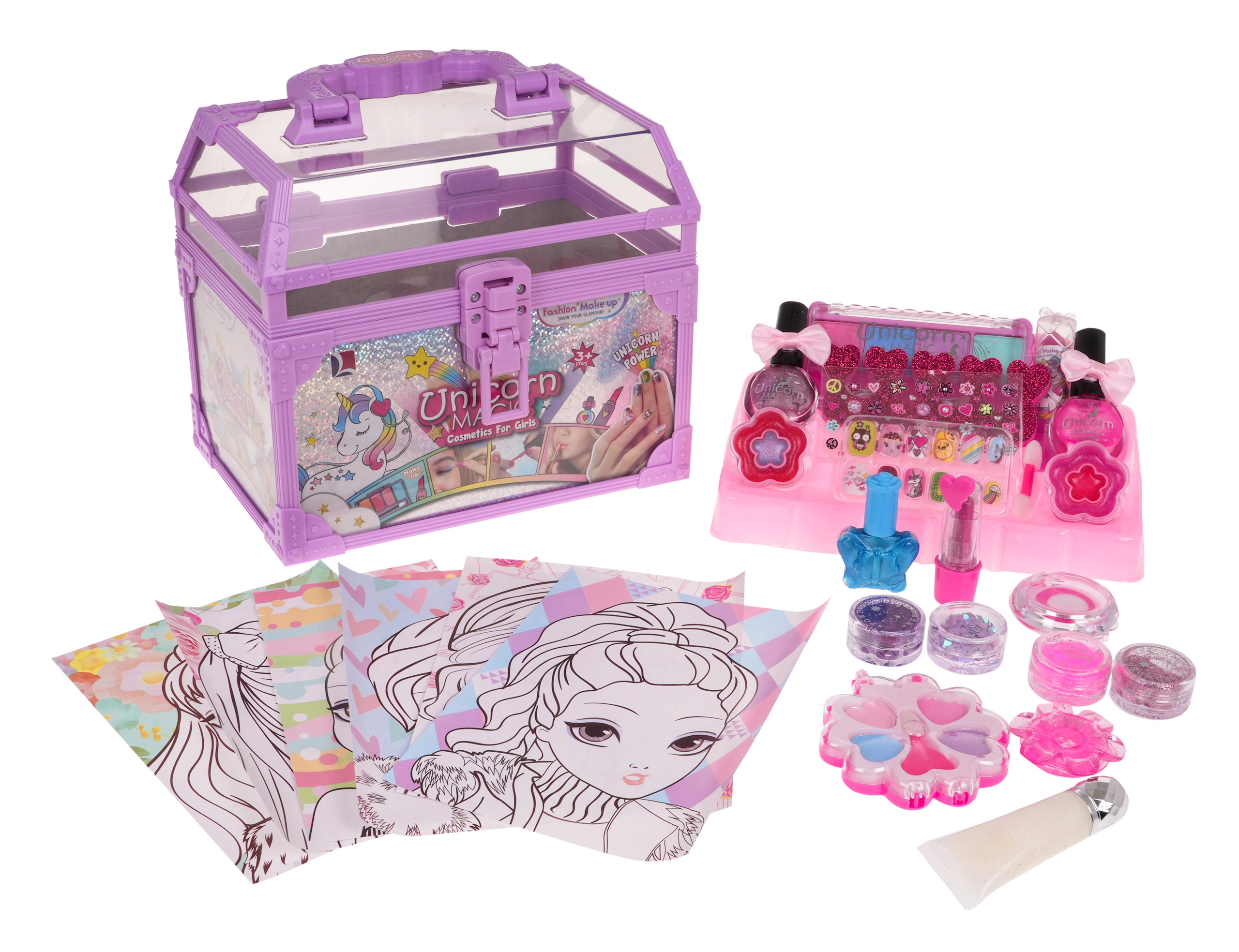Съдържа различни цветове лакове за нокти, гланцове за устни и сенки за очи. Всичко е подредено в декоративна кутийка с мотив на еднорог.