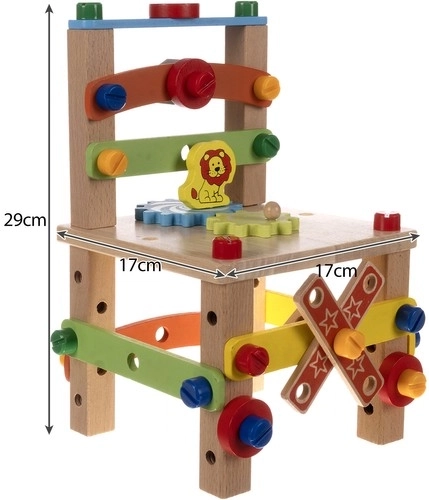 Спецификации: Детски стол с размери 29 x 17 x 17 cm е не само играчка, но и функционална мебел за вашия дом. Комплектът съдържа всичко необходимо за сглобяване.