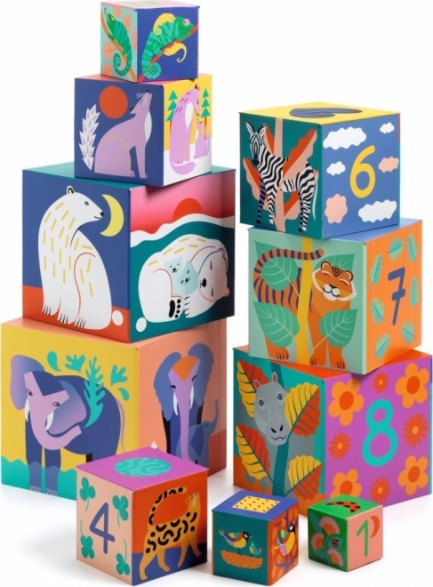 Пъстрата кула за подреждане от DJECO насърчава малките строители да откриват света на числата, формите и цветовете. Децата могат да подреждат кубчетата едно върху друго или едно в друго, като така развиват фината моторика, координацията ръка–око и естествено се запознават с броенето и животните. От 10 кубчета ще построите една пирамида с височина 86 см – а да я събориш е също толкова забавно, колкото и да строиш.
