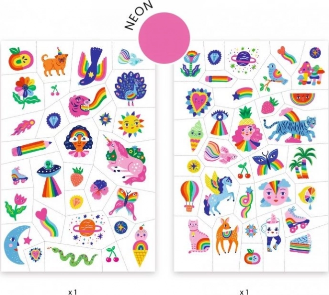 Тату комплекът DJECO Rainbow носи пъстри цветове и нежни, стилни илюстрации, които децата обожават. Поставянето е светкавично – достатъчно е да изрежете, отлепите фолиото и притиснете; татуировката се пренася мигновено върху кожата без нужда от вода.