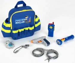 Открийте забавната полицейска раничка BEN & SAM от реномираната немска марка Klein – пълен комплект за малкия пазител на реда. Включва раничка с отражателни елементи, функционално фенерче, късовълнова радиостанция (имитация), свирка, полицейски знак, пластмасови белезници и воден пистолет. Благодарение на многото джобове и издръжливата изработка прибирането на играчките е бързо, подредено и безопасно.