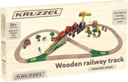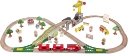 Тази богато оборудвана дървена железопътна линия носи на децата часове творческа игра. Частите са гладко обработени и боядисани с безопасни бои. Влаковите композиции се свързват със силни магнити, така че остават стабилни дори при повдигане. Комплектът включва кран, мостове, пътни знаци, дървета, сгради и работни автомобили – всичко необходимо за пъстри сцени.