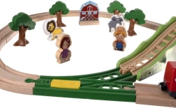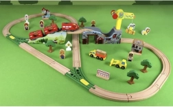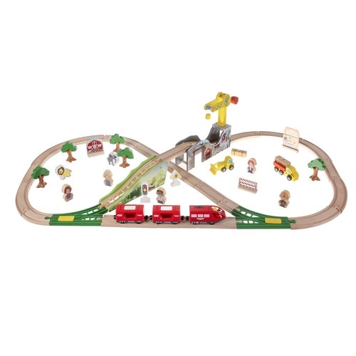 Открийте забавлението с качествена дървена железопътна линия с дължина 3,2 m, която включва 57 внимателно изработени части. Децата могат да строят собствени трасета, да карат влак с магнитно свързани вагони и чрез игра да развиват фината моторика, пространственото възприятие и креативността. Включени са превозни средства, фигурки, животни, дървета, сгради и функционален кран за още повече фантазия.