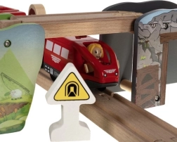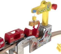 Пълният сет с релси, мостове, влак, кран, фигурки и аксесоари позволява на децата да създават собствени светове и винаги нови трасета.
