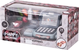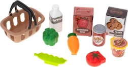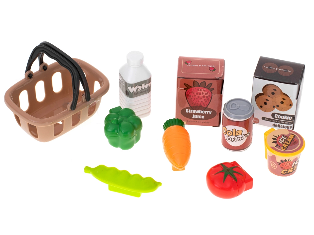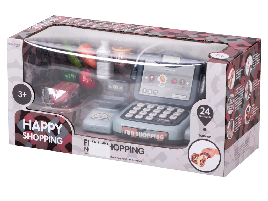 Част от комплекта е цветна кошница за пазаруване, а всички продукти имат баркод, който може да се сканира. Касата работи с батерии, така че децата могат да играят навсякъде.