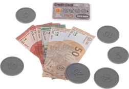 Комплектът включва различни видове детски пари, кредитна карта и богато разнообразие от стоки, което добавя реалистично усещане към играта на магазин.
