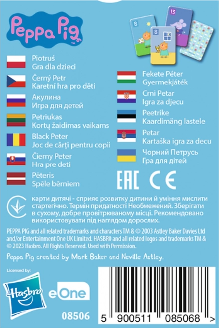 Забавна картична игра Черен Петър с мотив PEPPA PIG за деца от 4 години. Подпомага концентрацията, наблюдателността и социалните умения. В комплекта има 25 карти с любими герои, а лесните правила гарантират бърза и вълнуваща игра за до 5 играчи.