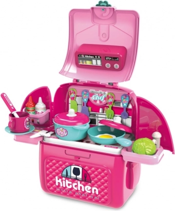 Нашият Кухненски комплект в раница предлага на децата безброй часове забавление и им позволява да имитират ежедневни дейности. Тази практична раничка, която лесно се превръща в настолна кухничка, е идеална за игра у дома и по време на път. Съдържа набор от аксесоари, които улесняват „готвенето“ и „печенето“. Този игрив комплект подпомага развитието на социални умения и креативност. Благодарение на компактния размер 24×15×27 см е лесна за пренасяне и децата могат винаги да я имат със себе си.