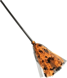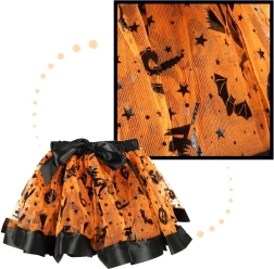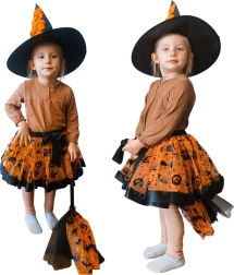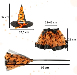 Стилен детски костюм на вещица в оранжево-черна комбинация ще зарадва както за Хелоуин, така и за маскен бал. Комплектът съдържа 3 елемента – шапка, тюлена (tutu) пола и метла. Благодарение на еластичната талия стои отлично на различни фигури и е идеален за карнавал, тематични партита и ежедневни игри.