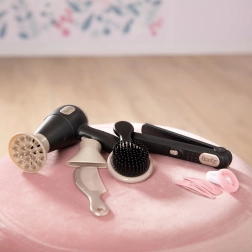 Сменяеми накрайници за сешоара, преса за коса, четка, гребен, фиби и ластици – всичко за създаване на фантастични прически.