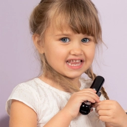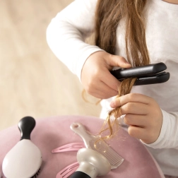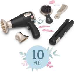 - Комплект оборудване: сешоар със светлинни и звукови ефекти, сменяеми накрайници, преса за коса, четка, гребен, фибички и ластици.