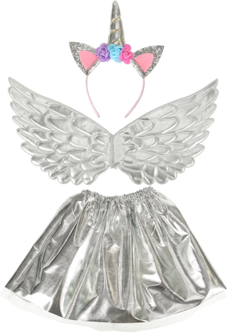 Този прекрасен костюм ще ви позволи да превърнете вашето дете в неповторим еднорог. Състои се от сребърна пола, елегантни крила и детайлно изработена диадема с розички. Идеален за всеки повод, в който детето може да се наслади на приказна игра.