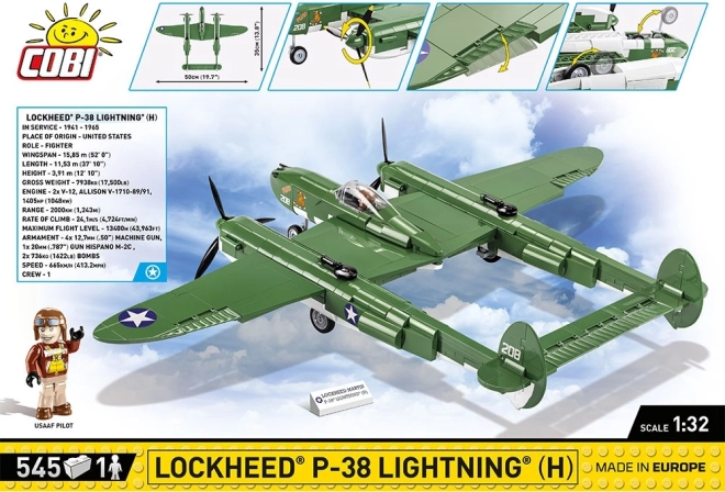 Сглобете легендарния американски изтребител от Втората световна война – LOCKHEED P‑38 LIGHTNING в мащаб 1:32 от COBI. Комплектът съдържа 545 елемента, детайлни принтове без стикери, подвижни елементи (перки, клапи, колесник) и отваряем кокпит с фигурка на пилот. Официалният лиценз LOCKHEED MARTIN гарантира вярно пресъздаване на емблематичната „Летяща рамка“.