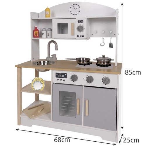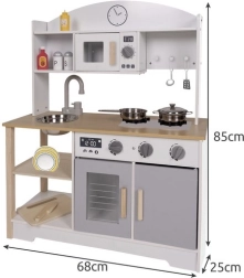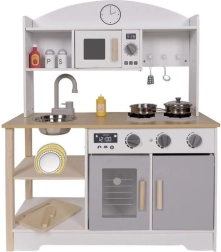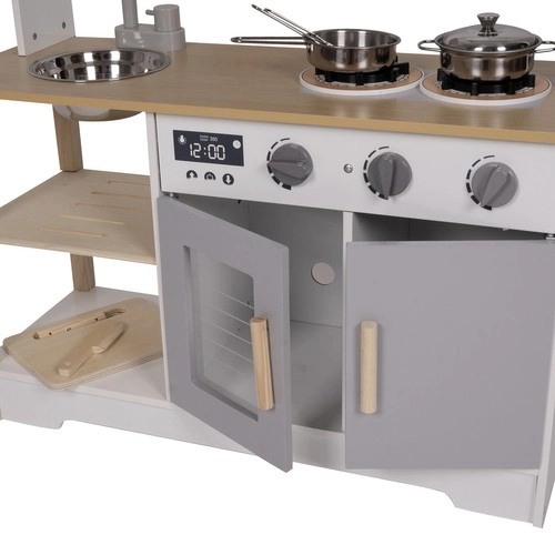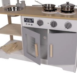 Стилна дървена детска кухничка с богат комплект аксесоари осигурява часове на креативна игра и учене. Предлага реалистични елементи като въртящи се копчета с кликване, аналогов часовник, мивка с подвижна ваничка и място за съхранение. Качествената дървена изработка в непреходни цветове (бяло, бежово, сиво) гарантира издръжливост и безопасно забавление за деца от 3 години.