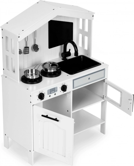Кухнята е оборудвана с въртящи се копчета за симулиране на регулиране на температурата и настройка на котлоните, което позволява креативна и безопасна игра.