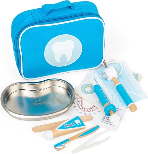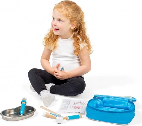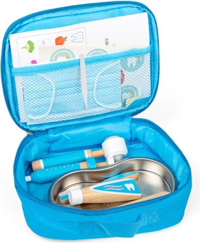 Стилният син куфар побира всичко, от което има нужда малкият зъболекар: дървена четка за зъби, тубичка за паста за зъби, инжекционна спринцовка, отоскоп, пинсета, маска, неръждаем поднос, стикер и лист с указания за правилно миене на зъби. Децата безопасно изпробват какво ги очаква при зъболекаря и естествено изграждат позитивно отношение към устната хигиена.