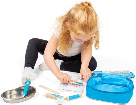 Играта на зъболекар развива комуникация, емпатия и сътрудничество с приятели. Частите са с размер, подходящ за детски ръце, и са изработени от качествени материали от отговорни източници, които отговарят на европейските стандарти за безопасност. Куфарът улеснява съхранението и пренасянето на целия комплект.