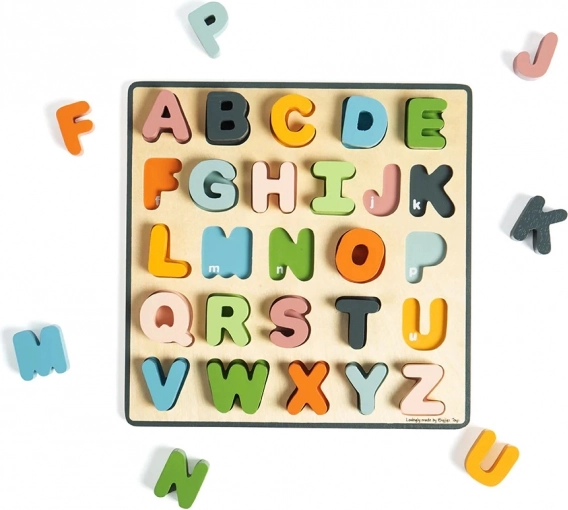 Дървеният пъзел с 26 пъстроцветни букви е перфектно средство за първи стъпки в изучаването на азбуката. Всяка буква има свой отвор в съответния цвят, което улеснява запомнянето и правилното съотнасяне. Благодарение на здравите и лесни за хващане елементи децата тренират координацията око–ръка и концентрацията.