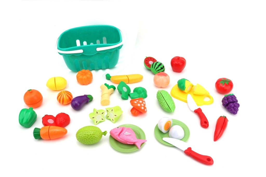 Този игрив комплект с храна за рязане носи на децата реалистично изживяване при готвене и пазаруване. Частите са леки, цветни и пригодени за малки детски ръчички. Храните благодарение на велкро или плъзгащи се съединения лесно се „разрязват“ и отново се съединяват, което подпомага фината моторика, координацията око-ръка и речника.
