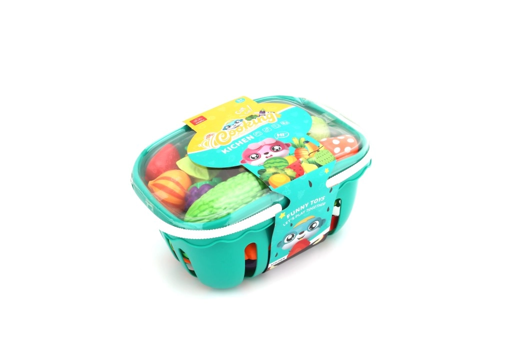 Развийте детското въображение с цветен кухненски комплект – практична кошница, пълна с плодове и зеленчуци, които могат да се „режат“ и отново да се съединяват. Идеален за игра на магазин и готвене. Съдържа до 30 части, включително кошница с капак, дъска за рязане, ножчета и разнообразни храни със съединяване с велкро. Лек пластмасов материал и лесно съхранение подпомагат безопасната и подредена игра.