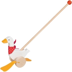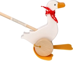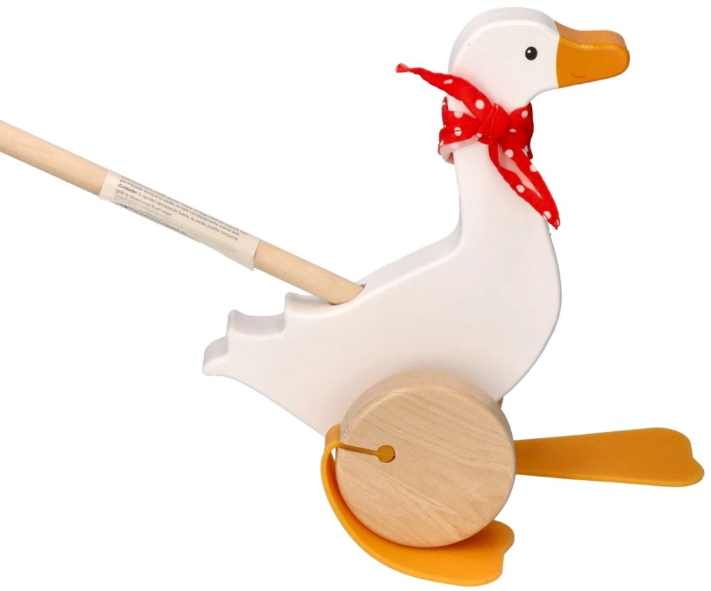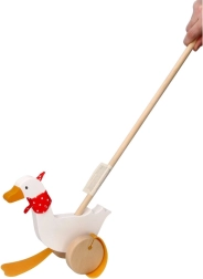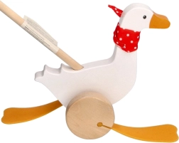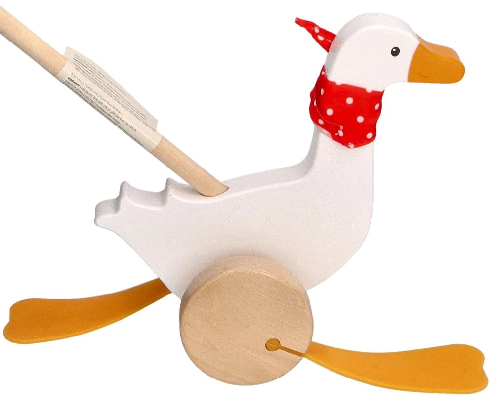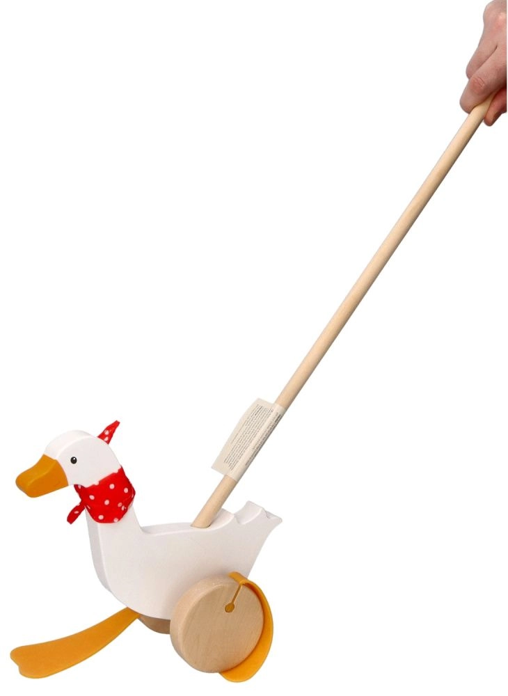 Детската гъска Berta от висококачествено дърво радва с класически дизайн с червен шал на точки и изразителни „плавателни“ крачета, които се движат сладко при бутане. Дългата пръчка улеснява воденето на играчката и насърчава активното движение на децата.