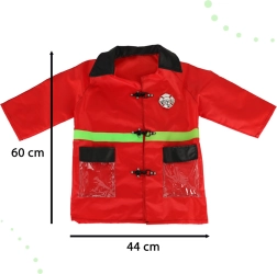 Детският костюм включва яке, проектирано да изглежда като истинско пожарникарско яке благодарение на червения цвят и отражателните зелени елементи.