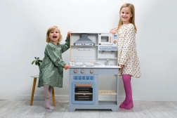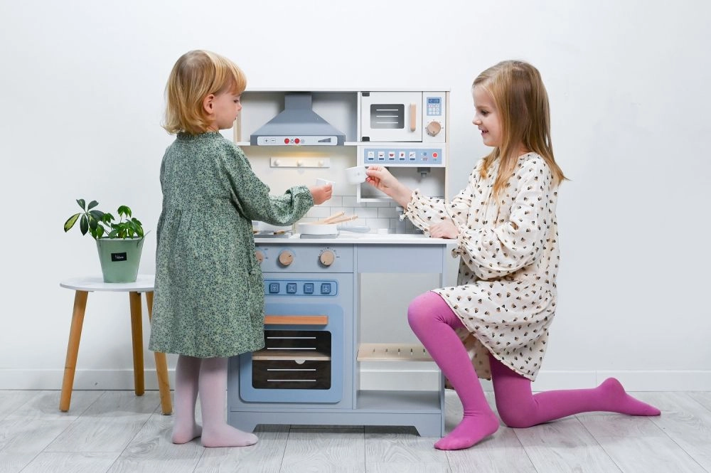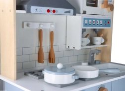 Тази дървена интерактивна кухничка с аспиратор носи на децата автентично кухненско изживяване в безопасна и издръжлива форма. Реалистични елементи като плот, фурна, мивка и микровълнова подкрепят фантазията и ролевата игра, докато въртящите се копчета и бутоните засилват сетивното изживяване при игра.