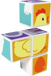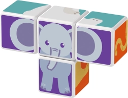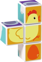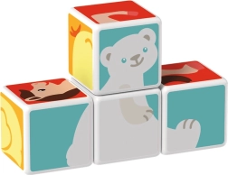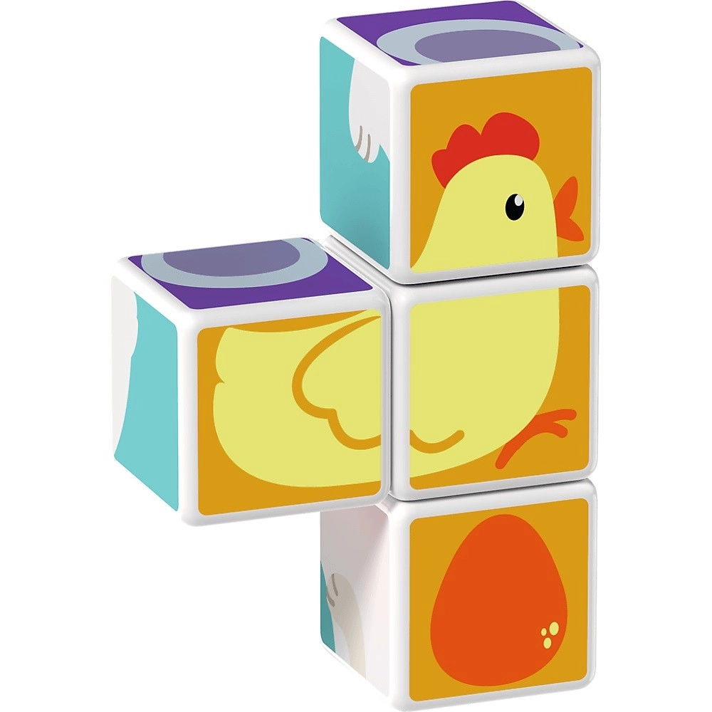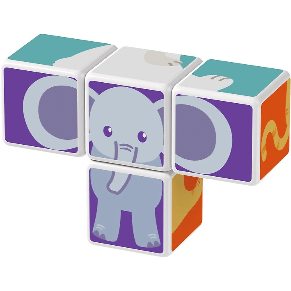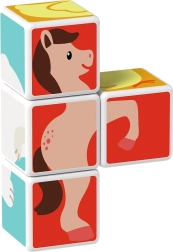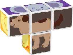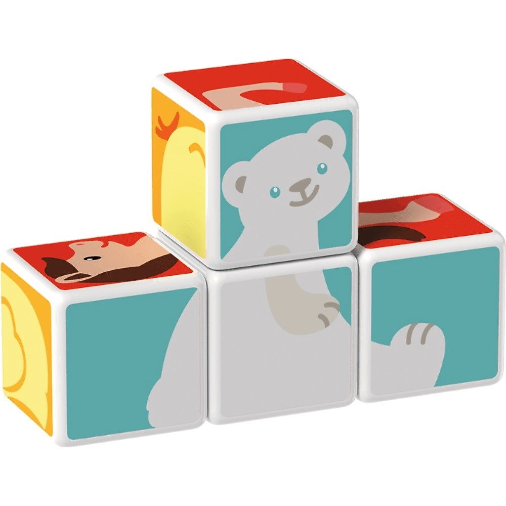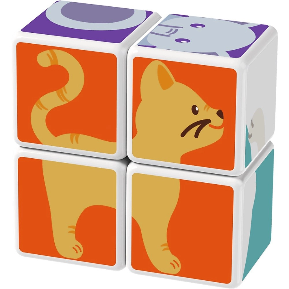 Четири магнитни кубчета се съединяват от всички страни и позволяват на децата лесно да подредят цели картинки на животни и прости 3D форми.