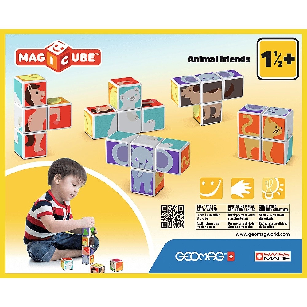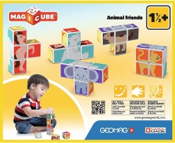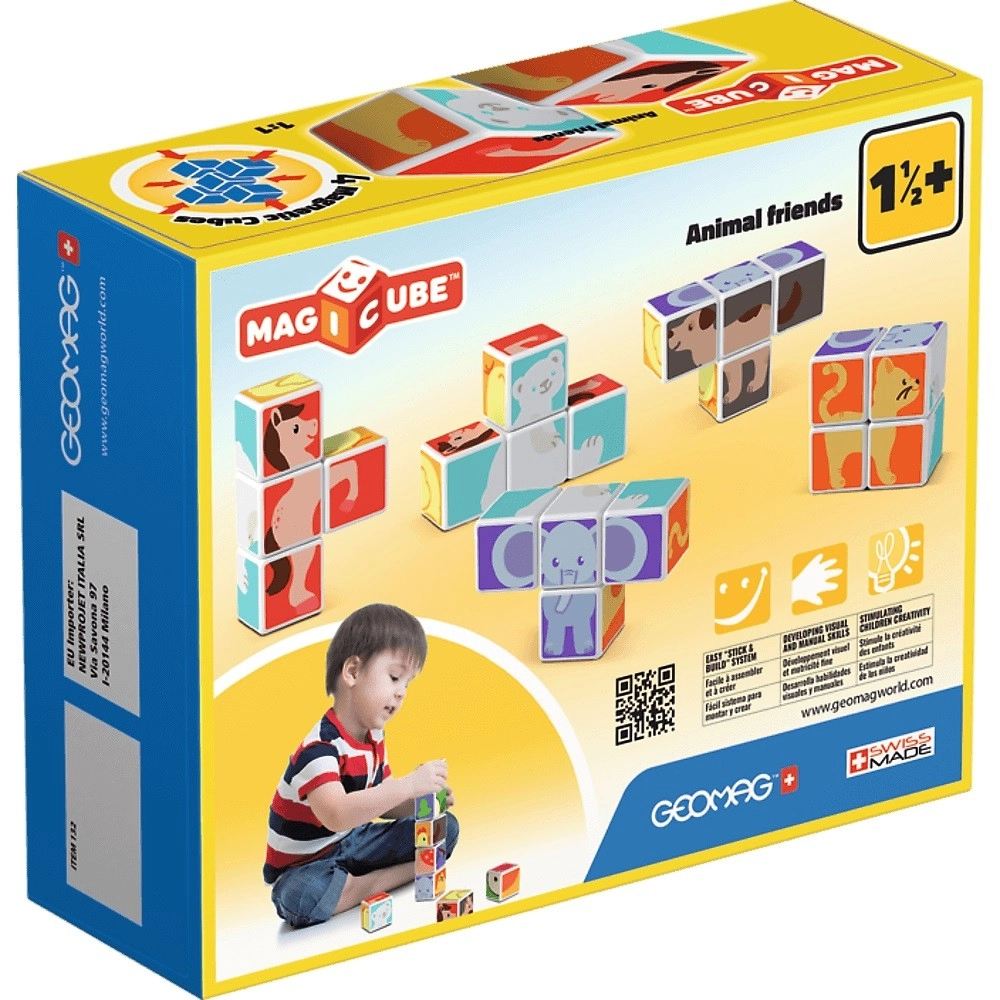Открийте магията на конструктора GEOMAG Magicube: четири магнитни кубчета с животински мотиви, които лесно се захващат от всички страни. Децата могат да построят полярно кученце, котенце, кокошка, мечето, конче или слон, или да създадат собствени форми. Конструкторът развива фината моторика, логическото мислене, координацията и фантазията и мотивира към разказване на истории. Включени са 6 карти с идеи. Произведено в Швейцария.