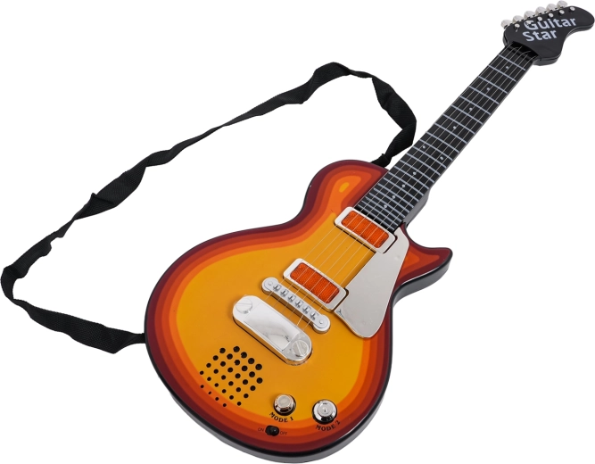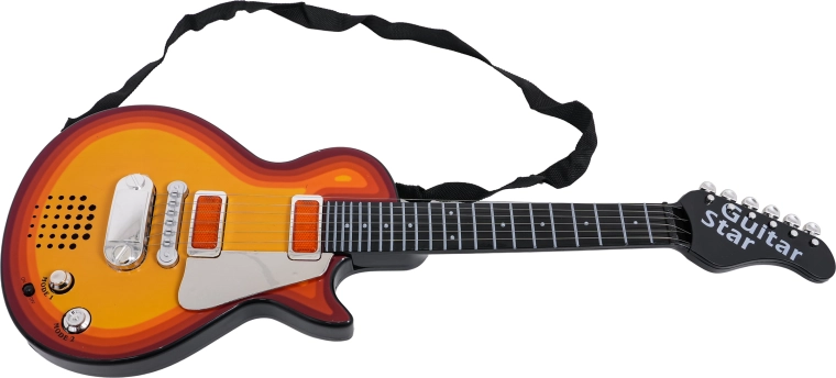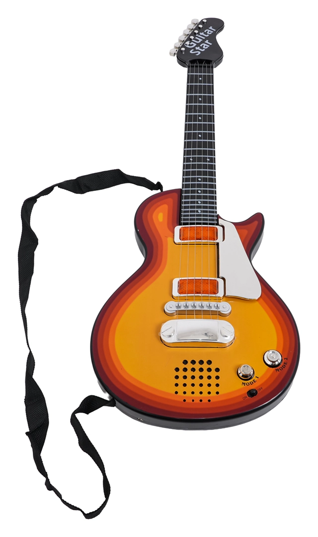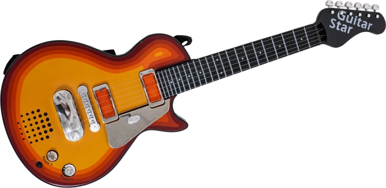 Благодарение на олекотената конструкция и удобния ремък инструментът е идеален за деца от 3 години. Китарата има CE сертификация и е безопасен и забавен избор за първи контакт с музиката. Захранването се осигурява от 3× AA батерии (не са включени).