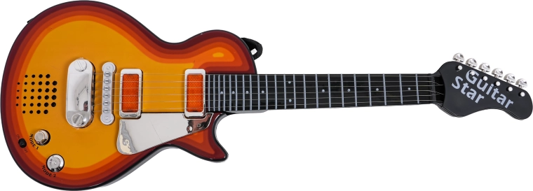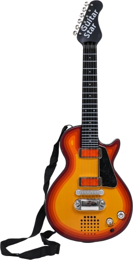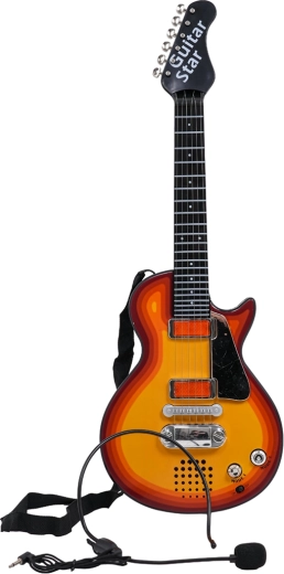 Тази детска електрическа китара е перфектен избор за малки рокери и рокерки. Позволява както възпроизвеждане на готов рок съпровод, така и собствено свирене – при допир до металните струни китарата издава звук. Включеният хедсет със слушалки и микрофон се включва директно в китарата, така че детето може да пее и свири едновременно.