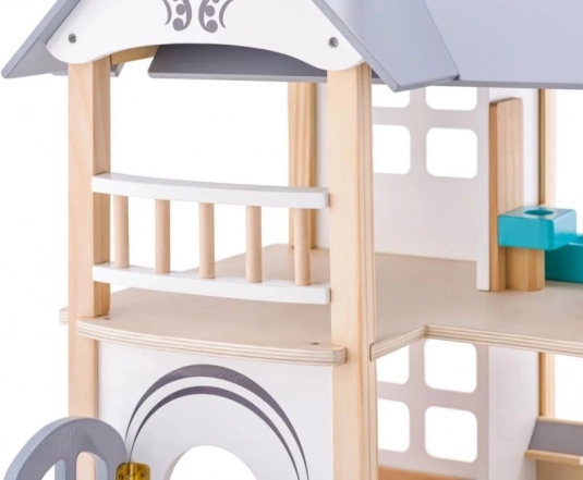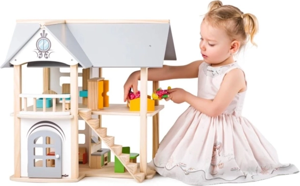 Тази красиво изработена къща за кукли е идеалното допълнение към детската стая. С размери 53 x 32,5 x 51 см тя осигурява достатъчно място за подреждане на включените мебели. Къщата е изработена от естествено дърво с пастелни акценти и е подходяща за деца от 3 години.