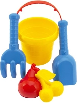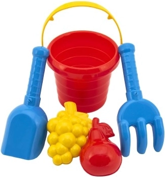 Този комплект за пясък съдържа цветна кофичка, лопатка, гребло и две формички, които са перфектно пригодени за малки детски ръчички. Изработен е от качествена и издръжлива пластмаса, която осигурява дълъг живот дори при интензивни игри в пясъка.