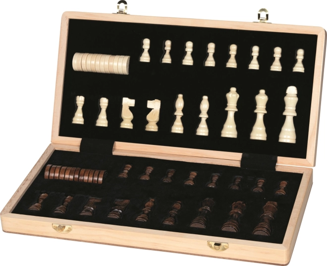 Практична дървена шахматна дъска, която се сгъва в компактен куфар с щипки, като вътре безопасно се съхраняват всички фигури.