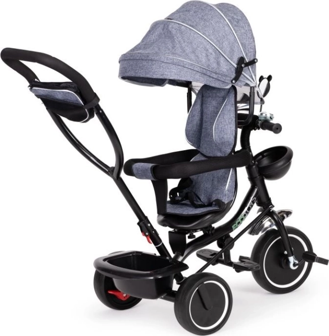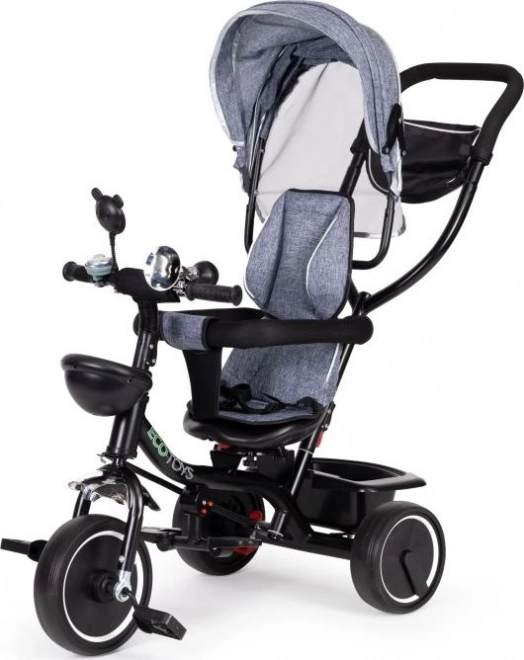 Триколката ECOTOYS осигурява комфорт благодарение на меката облегалка и предпазните колани. Подвижната козирка защитава от слънце и дъжд.