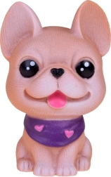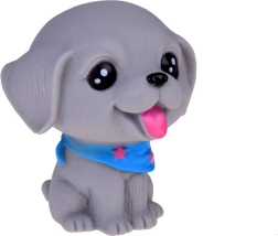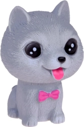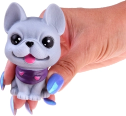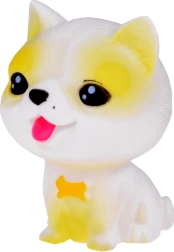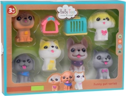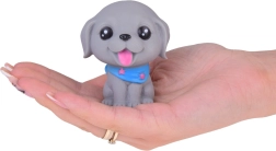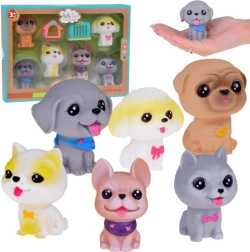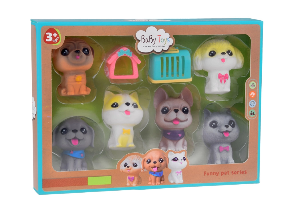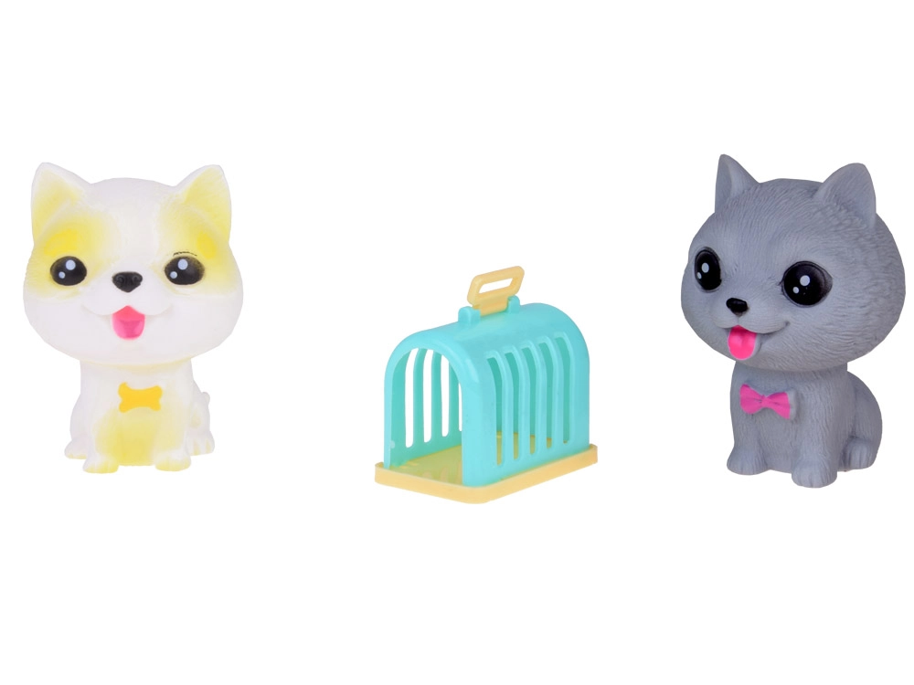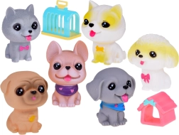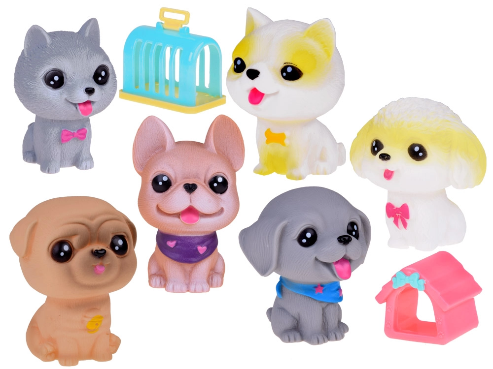 Всяко куче издава забавен писклив звук при натиск и има малък отвор в долната част. Комплектът включва различни породи като булдог, шиба ину, пудел, веймаранер, мопс и късокосмест чихуахуа, всяко със свои очарователни аксесоари. Освен това включва мини къщичка и транспортна клетка.