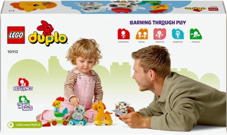 Комплектът съдържа 4 животни за сглобяване (петел, кон, овца и кравичка) и 3 здрави вагончета, които се свързват лесно. Големите, заоблени части DUPLO са безопасни и идеални за малки ръчички. Родителите могат лесно да се включат и да подкрепят свободната игра, изразяването и откриването на света.
