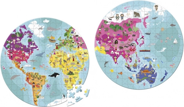 Кръглият пъзел JANOD Земно кълбо е красиво илюстриран и идеален за деца и възрастни, които обичат подреждането и откриването. Докато подреждат отделните части, децата научават къде по света живеят различни видове животни и едновременно тренират концентрацията си.