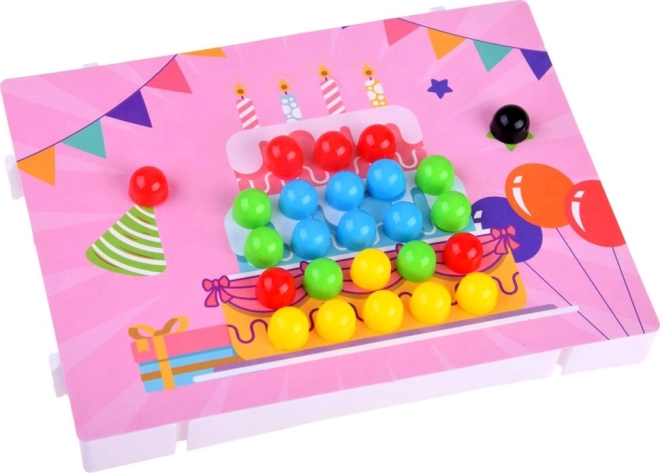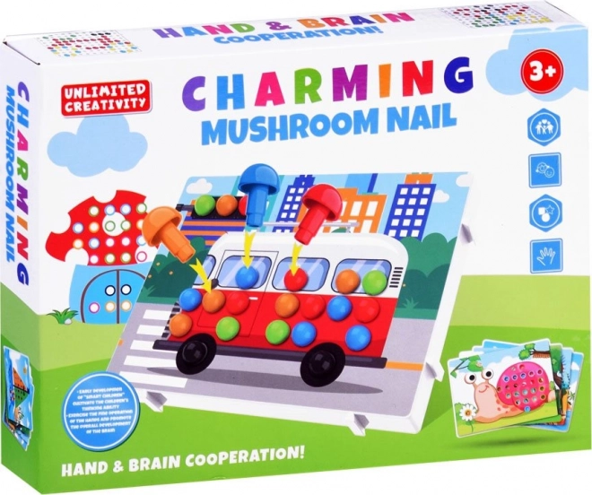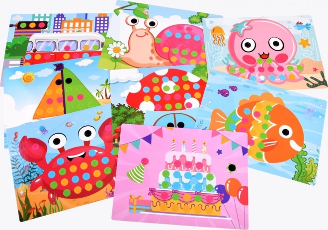 Тази цветна образователна сглобка с колчета предлага на децата часове творческо забавление. Здравата пластмасова подложка и илюстрираните карти с отвори водят малките творци стъпка по стъпка – нужно е само да съчетават колчетата в правилните цветове и картината оживява. Играта естествено тренира фината моторика на пръстите, логическото мислене и координацията око–ръка.