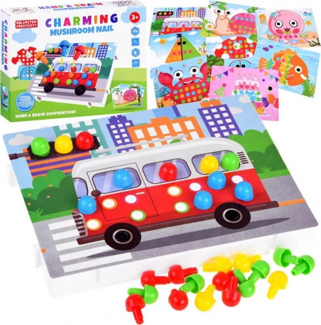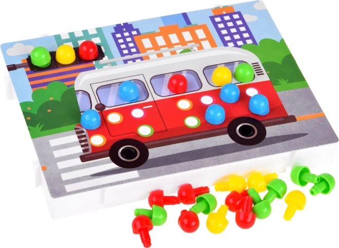 В комплекта има богата селекция от колчета и разнообразни мотиви (напр. рибка, автобус или охлюв), така че децата ще упражняват и различаването на цветове и форми и могат да се впуснат в собствени идеи. Благодарение на простия принцип мозайката е идеална за предучилищна възраст и по-малки деца.